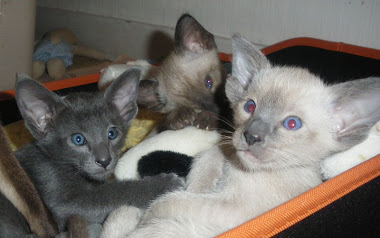 Onze drie kittens heten Félix (kater, sealpoint), Fae (poes blue point) en Farrah (poes oosterse korthaar blauw).
